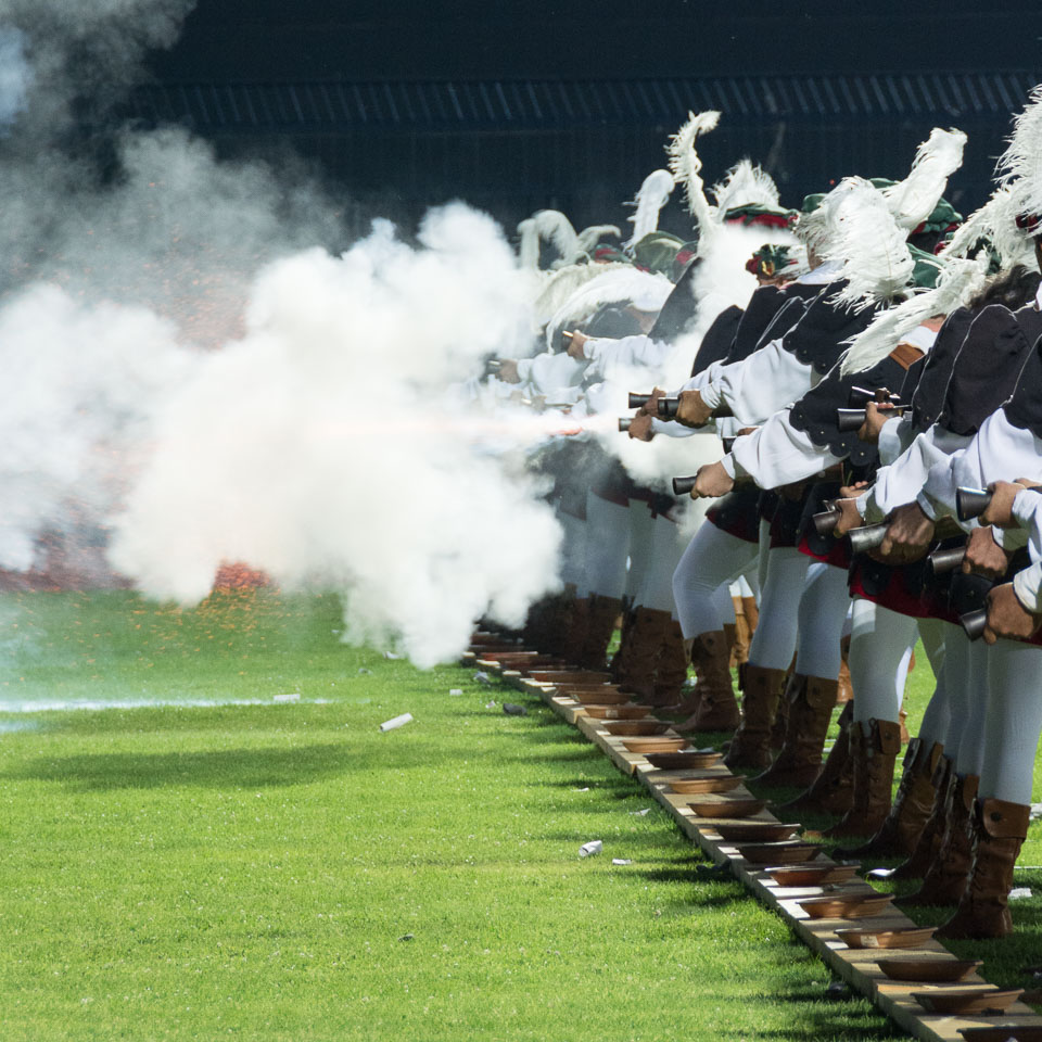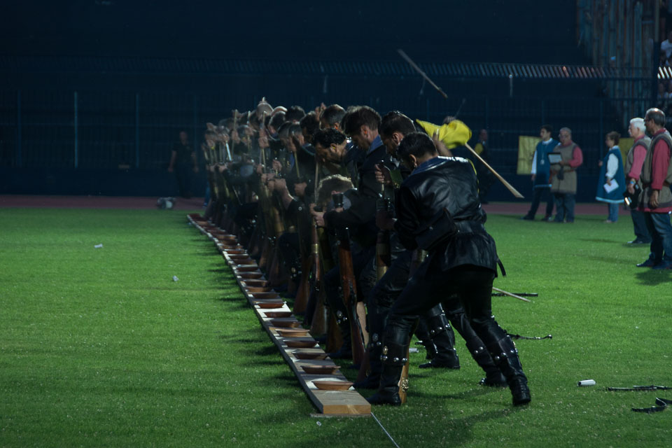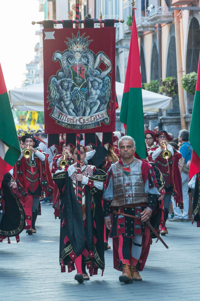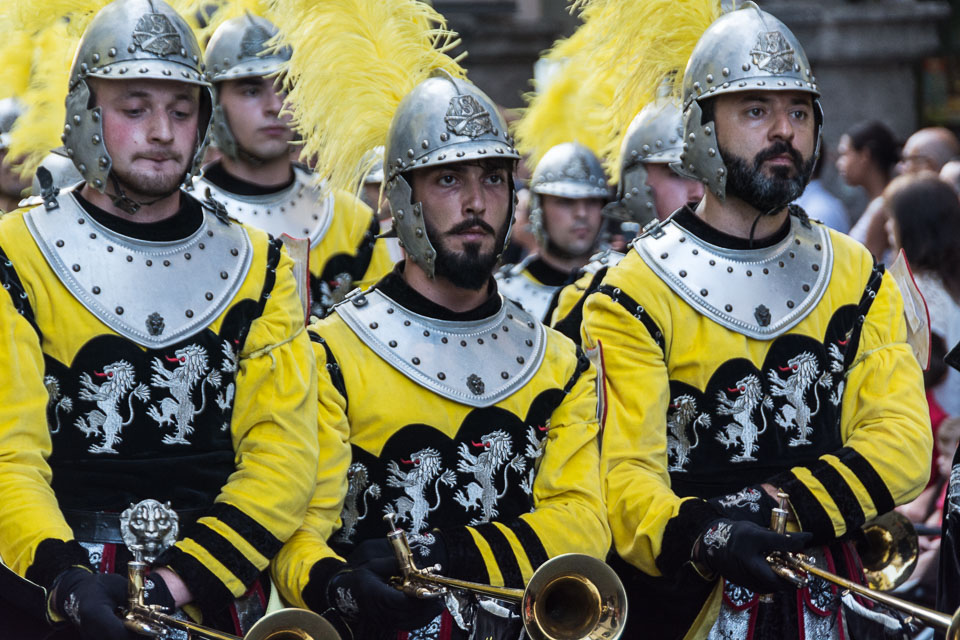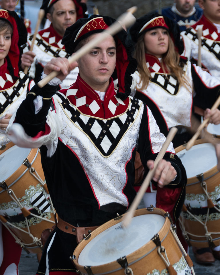 Photographs of the parades by the Trombonieri from the hamlets comprising Cava de' Tirreni, in Campania, and of the Disfida dei Trombonieri - marching and firing their arquebuses.